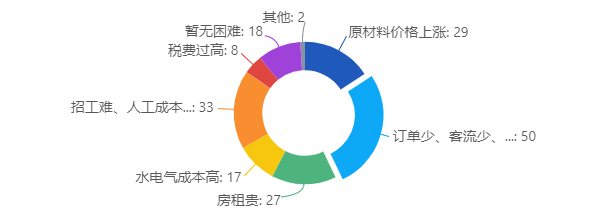 統計樣本中,營業59家、歇業12家、已注銷19家,占比分別為65.56%、13.33%、21.11%;經營地址在城市42家、鄉鎮駐地14家、農村20家、開發區5家,占比分別為51.85%、17.28%、24.69%、6.17%;經營場所性質,租用公有住房5家、租用私人住房46家、使用自有住房11家、其他19家,占比分別為6.17%、56.79%、13.58%、23.46%;創業者(法定代表人)年齡20多歲7人、30多歲44人、40多歲19人、50多歲10人、60多歲1人,占比分別為8.64%、54.32%、23.46%、12.35%、1.23%;按法定代表人戶籍地統計,市內69人、省內市外7人、國內省外5人、國外0人,占比分別為85.19%、8.64%、6.17%、0%;按法定代表人學歷統計,大專及以下67人、大學本科11人、碩士研究生3人、博士研究生0人,占比分別為82.72%、13.58%、3.7%、0%;按法定代表人創業次數統計,首次(應屆大學生)9人、首次(非應屆大學生)43人、二次17人、三次以上(含三次)12人,占比分別為11.11%、53.09%、20.99%、14.81%;按法定代表人創業培訓情況統計,36人受過培訓、45人未受過培訓,占比分別為44.44%、55.56%;按主體實有員工人數統計,0-10人(不含10)66家、10-20人(不含20)9家、20-30人(不含30)3家、30-40人(不含40)2家、40人以上 1家,占比分別為 81.48%、11.11%、3.70%、2.47%、1.23%;按主體成立以來總體盈利情況統計,盈利14家、盈虧平衡38家、虧損29家,占比分別為17.28%、46.91%、35.8%;按經營中面臨的困難統計,選擇原材料價格上漲有29家、選擇訂單少客流少消費不足50家、選擇房租貴27家、選擇水電氣成本高17家、選擇招工難人工成本較高33家、選擇稅費過高8家、選擇暫無困難18家、選擇其他困難2家,占比分別為15.76%、27.17%、14.67%、9.24%、17.93%、4.35%、9.78%、1.09%。