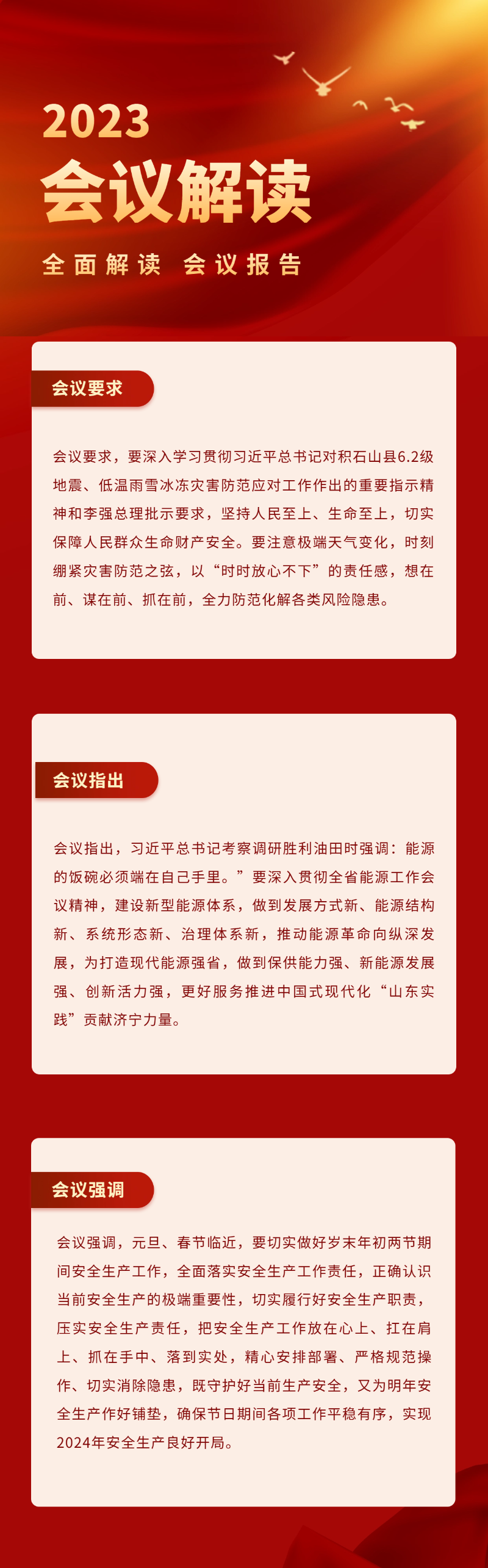 會議要求,要深入學習貫徹習近平總書記對積石山縣6.2級地震、低溫雨雪冰凍災害防范應對工作作出的重要指示精神和李強總理批示要求,堅持人民至上、生命至上,切實保障人民群眾生命財產安全。要注意極端天氣變化,時刻繃緊災害防范之弦,以“時時放心不下”的責任感,想在前、謀在前、抓在前,全力防范化解各類風險隱患。